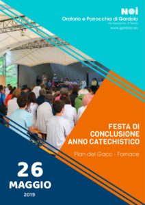Il 26 maggio 2019 si svolgerà al Pian del Gacc la festa di ringraziamento per la conclusione delle attività parrocchiali. Sarà l’occasione per concludere i percorsi iniziati durante l’anno catechistico.