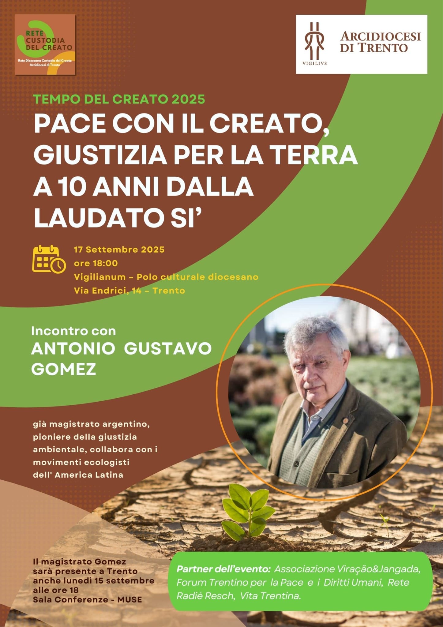 Mercoledì 17 settembre, ore 18.00 – Trento, Vigilianum incontro dal titolo “Pace con il Creato. Giustizia per la Terra a 10 anni dalla Laudato sì” con la testimonianza del prof. Antonio Gustavo Gomez: magistrato argentino, consulente di papa Francesco per l’enciclica Laudato sì.