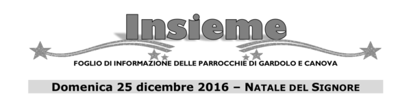 Notte di Natale Sabato 24 dicembre 2016 Ore 21.00 a Gardolo Ore 22.00 a Canova Giorno di Natale Domenica 25 dicembre 2016 Ore 08.00 a Gardolo Ore 09.30 a Canova Ore 11.00 a Gardolo